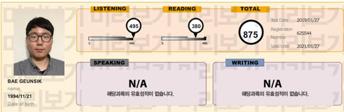 배근식, 주 2일반 5주 수강 후 875점 달성!