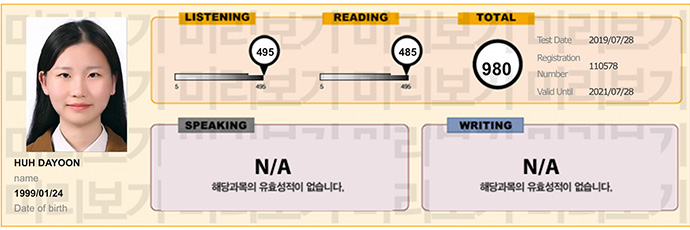 허다윤, 690점에서 5주 수강 후 980점 달성